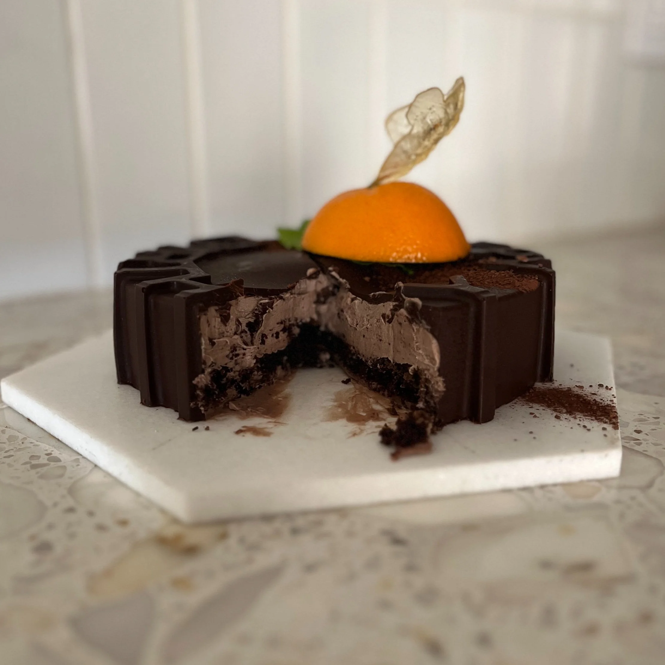 Nō 2 -------- FALLEN LEAVES ENTREMET -hazelnut sponge entremet with additional layers of salted caramel, peach in natural juices, all enveloped in a citrus white chocolate mousse. glazed with a white chocolate mirror glaze. adorned with a caramelized and sprinkled spice chocolate leaf on a stem and a fallen crystal leaf. one size only. custom flavor pairings available. $165 serves 6 - 8