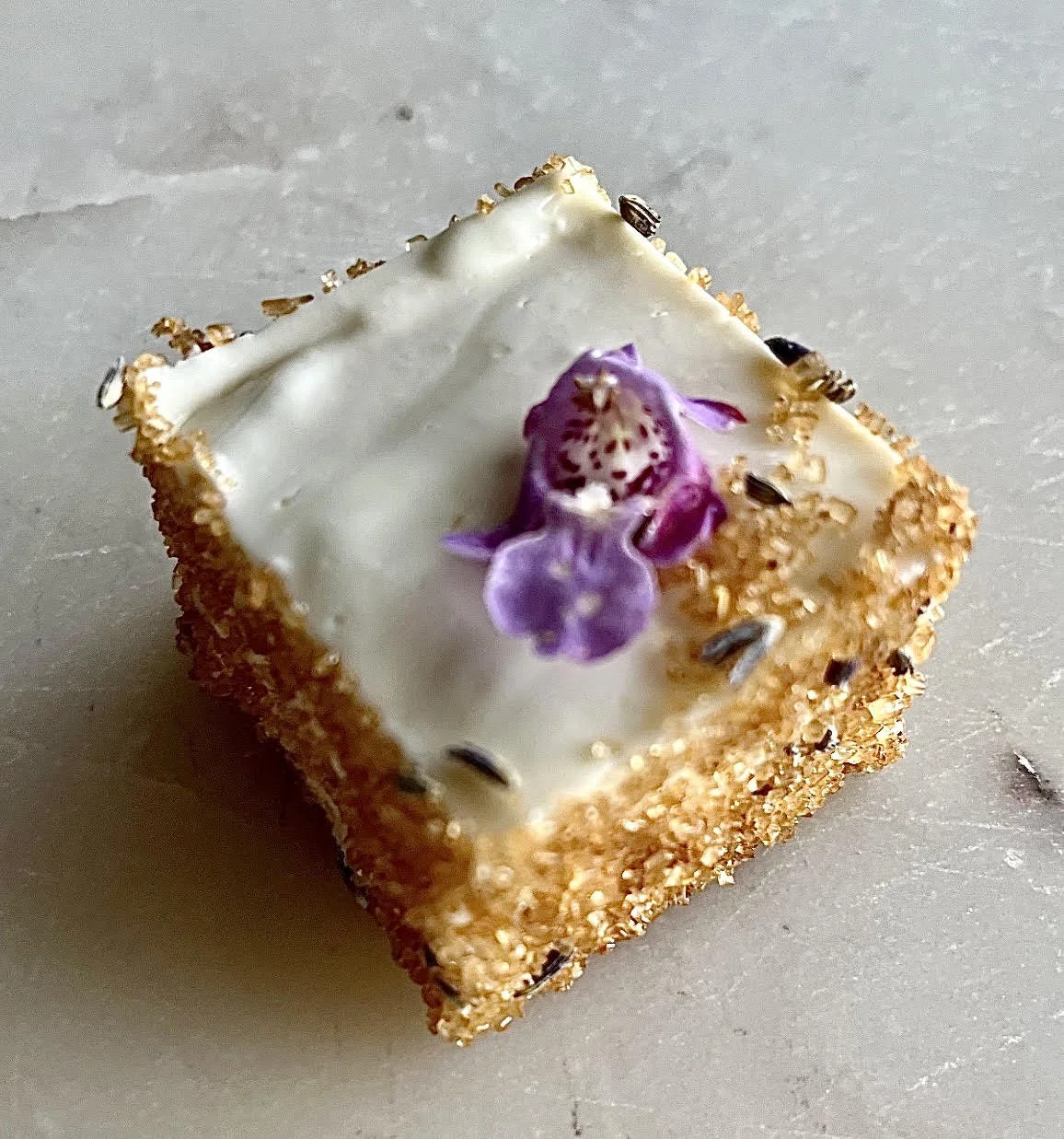 Nō 23 -------- FLOWER BOX CAKE - vanilla bean and a housed blend of poppy and chia seeds cream between multi-layers of vanilla cake. house in a white chocolate sculpted box, hand formed sugar petals and leaves and edible pansy blooms. serves 6 - 10 but custom size available. starting at $250